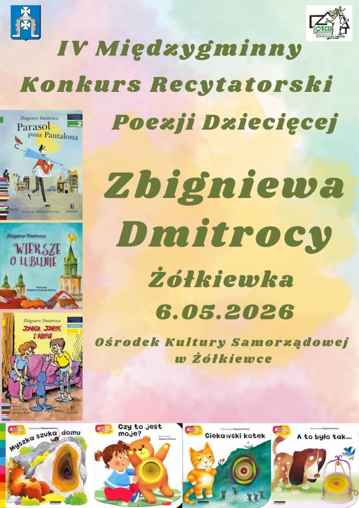 Ośrodek Kultury Samorządowej w Żółkiewce zaprasza do udziału w IV Międzygminnym Konkursie Recytatorskim Poezji Dziecięcej Zbigniewa Dmitrocy Poeta od przeszło 20 lat związany jest z gminą Żółkiewka. Konkurs recytatorski odbędzie się Ośrodku kultury Samorządowej w Żółkiewce dnia 06.05.2026r. (środa), godz. 9.00. Konkurs przeznaczony jest dla...