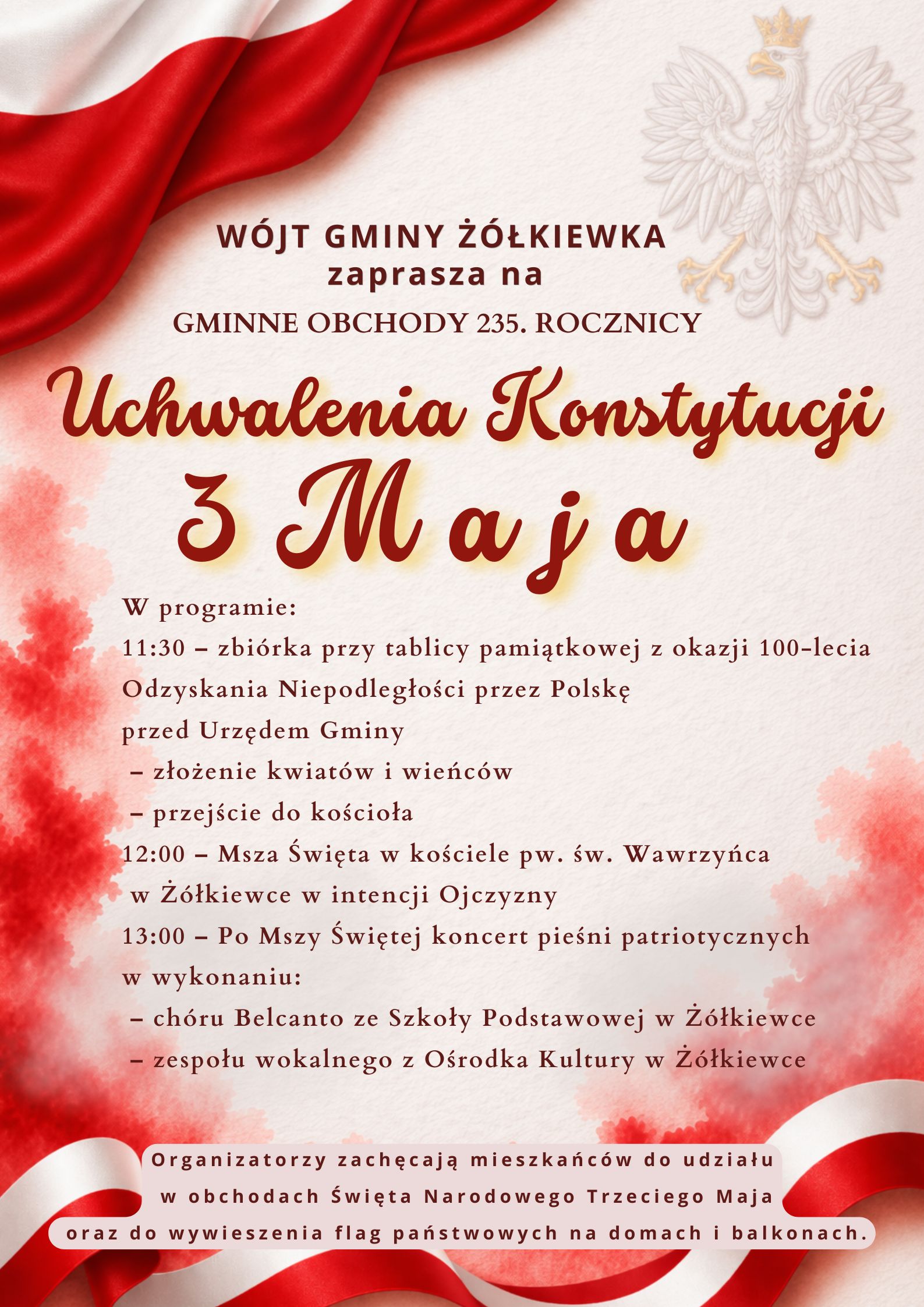 Serdecznie zapraszamy wszystkich mieszkańców do wspólnego świętowania uroczystości 3 Maja. Spotkajmy się, aby razem uczcić to ważne dla naszej historii i tożsamości narodowej święto w atmosferze jedności i radości. Do zobaczenia!
