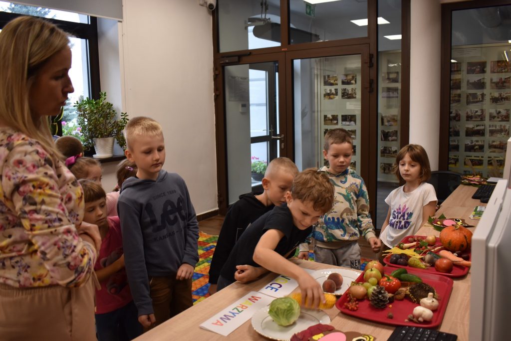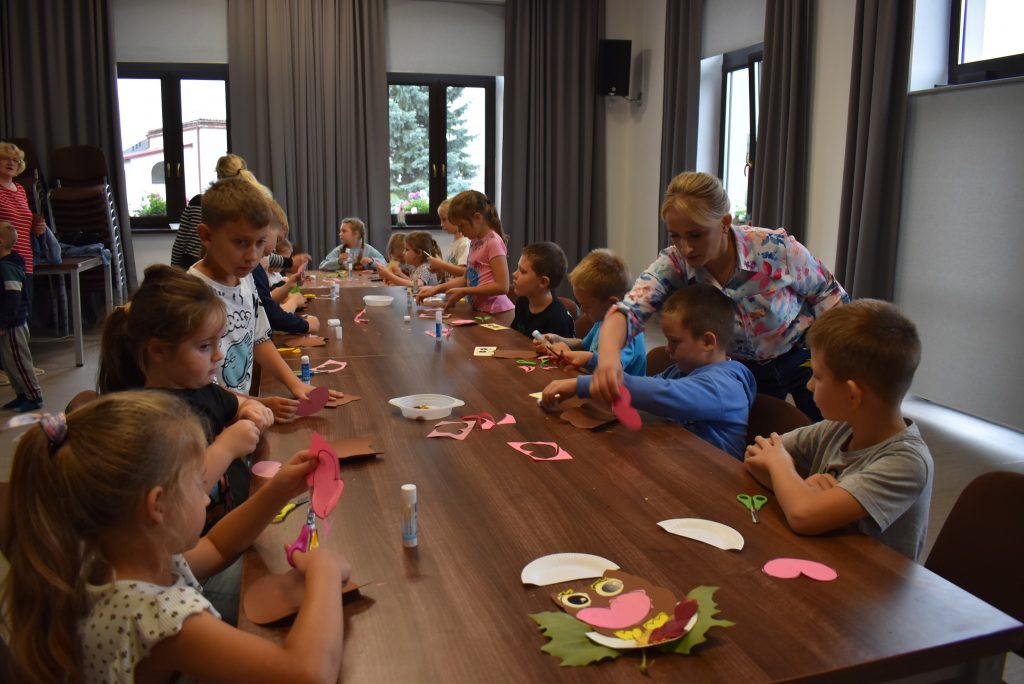 Pani Magda przygotowała część rękodzielniczą – dzieci z wielkim zaangażowaniem tworzyły kolorowe, jesienne sowy, wykorzystując różnorodne materiały plastyczne. Z kolei pani Małgosia zadbała o stronę edukacyjną: przedstawiła ciekawe informacje o jesieni, przygotowała zestaw tematycznych łamigłówek oraz – dzięki hojnie zebranym darom jesieni – zorganizowała zabawę w ich segregację na owoce, warzywa i skarby lasu.